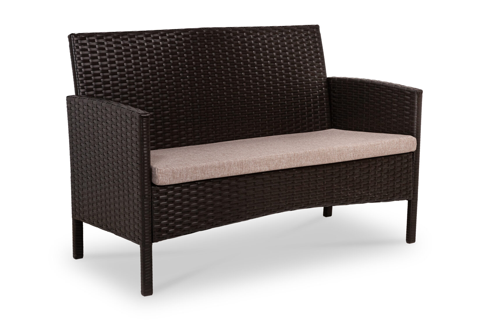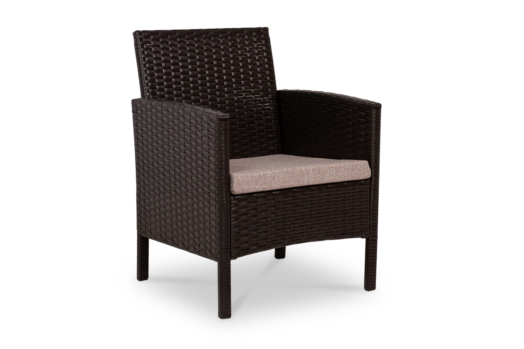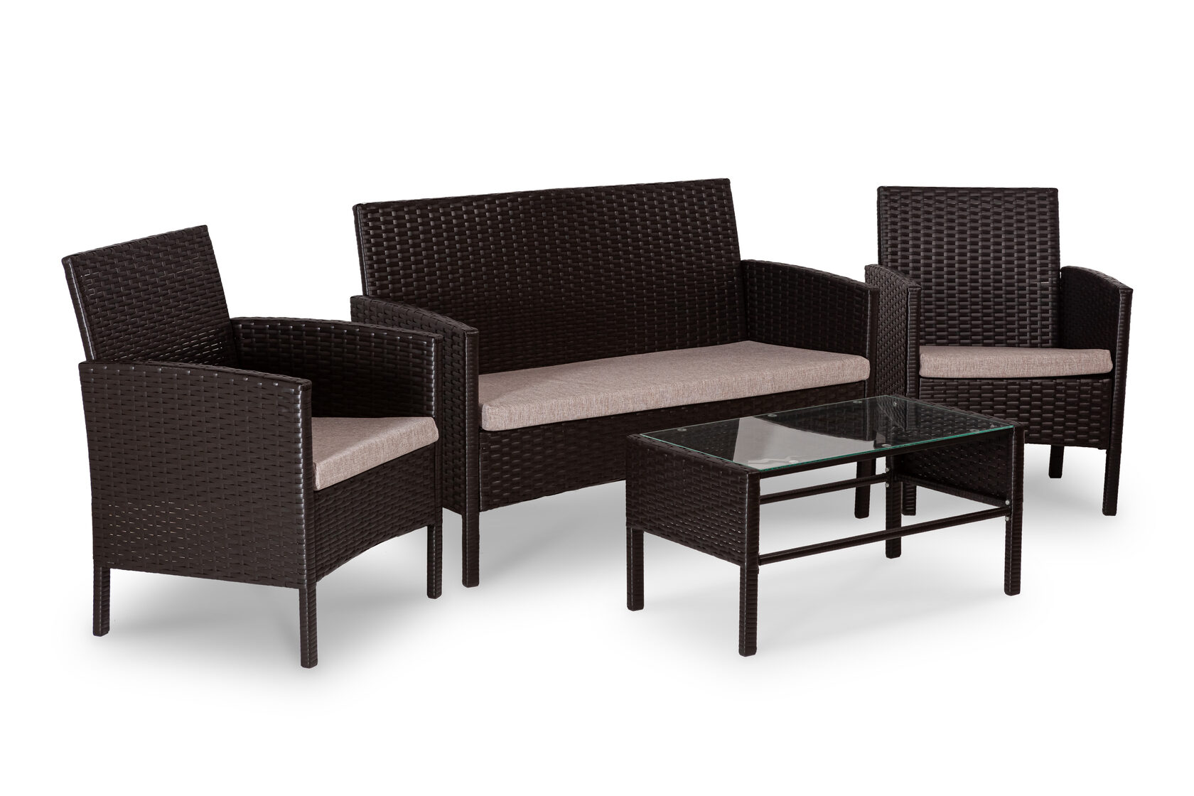 Российское производство Материал – искусственный ротанг Водонепроницаемая ткань Съёмный чехол Материал чехла мягких элементов –полипропилен Каркас – металл Материал столешницы – закалённое стекло